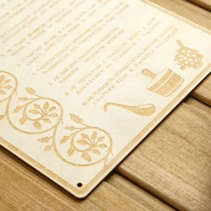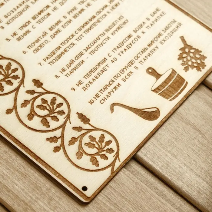 Таблички в бане информируют гостей о правилах посещения парной, помогают с навигацией и просто украшают интерьер. Такой аксессуар из дерева не выделяет вредных веществ, он безопасен и долговечен.