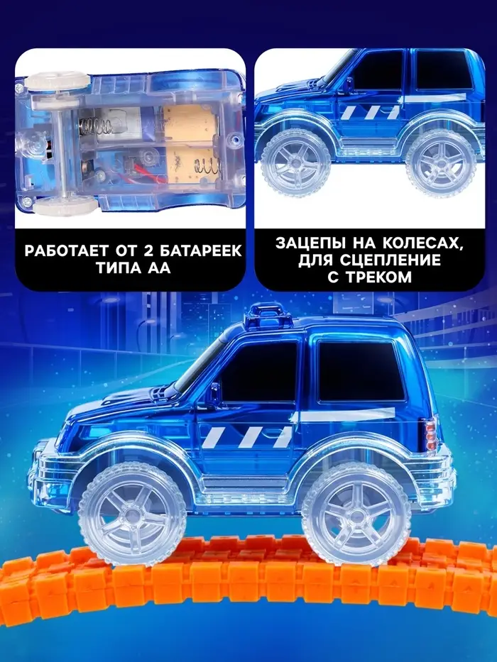 Пришло время эффектных световых шоу — скоростных заездов на гибком треке! Постройте крутую трассу с мостами, спусками, подъемами и мёртвыми петлями и запускайте по ней эту машинку! Ни один юный гонщик не останется равнодушным!