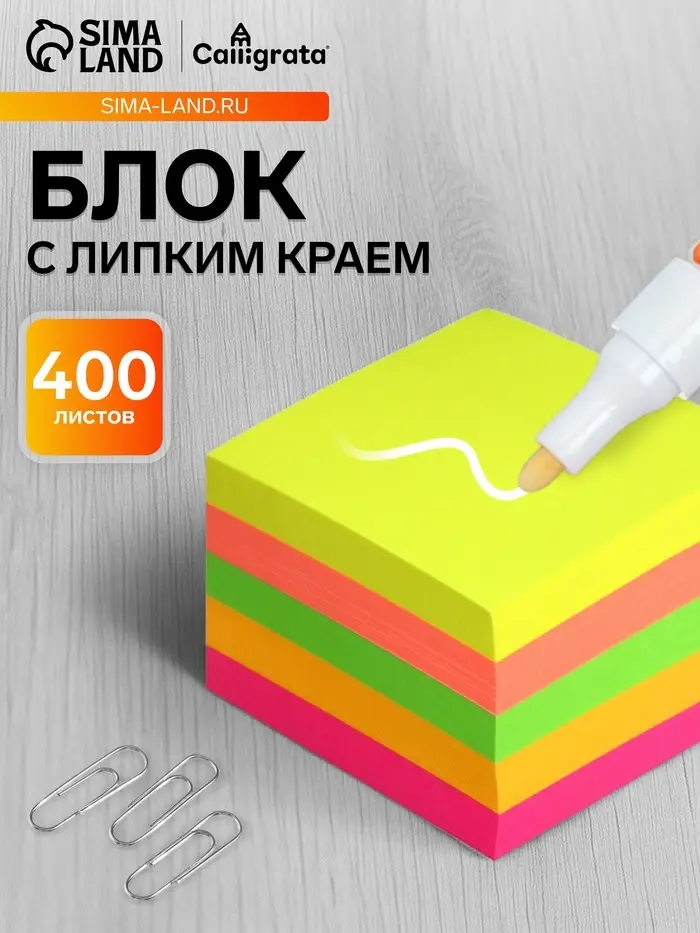 Блок с липким краем, 51×51 мм, 400 листов, флуоресцентный, 5 цветов