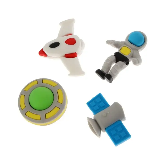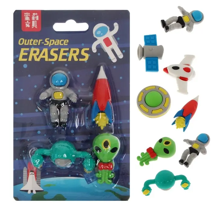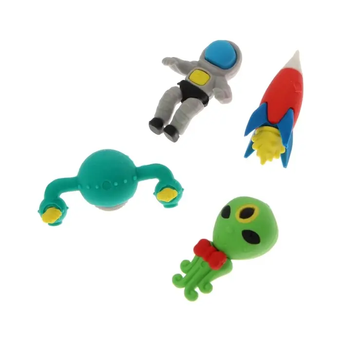 Фигурные ластики выполнены в форме космических персонажей, что позволяет превратить процесс стирания в игру. Подходят для удаления надписей, сделанных чернографитными карандашами.