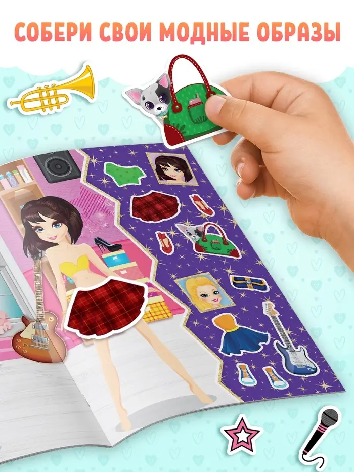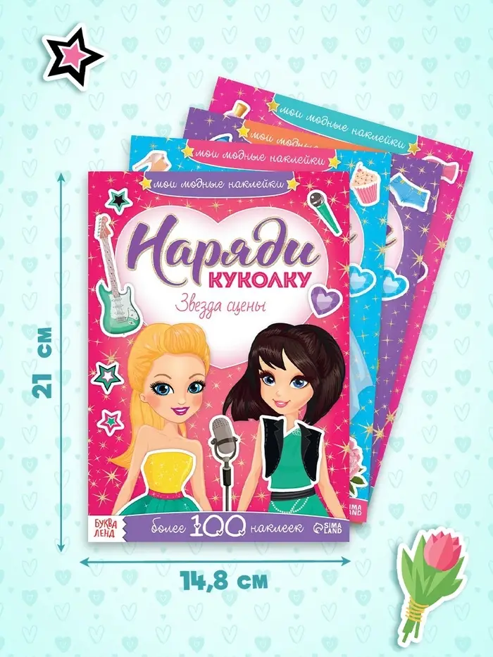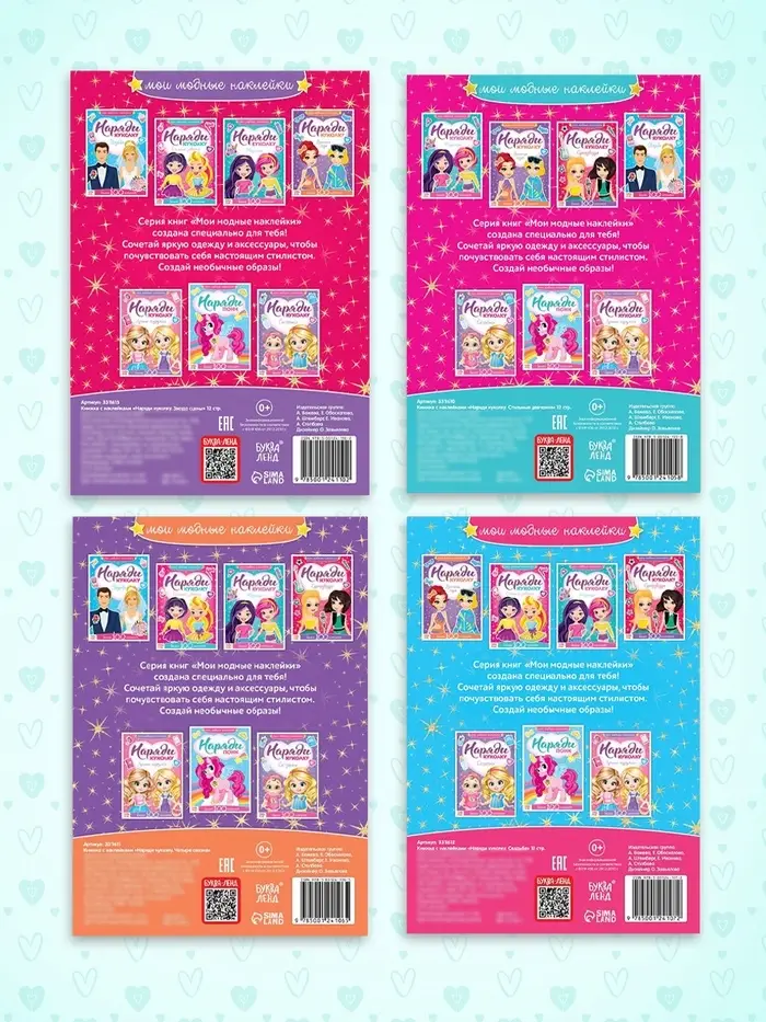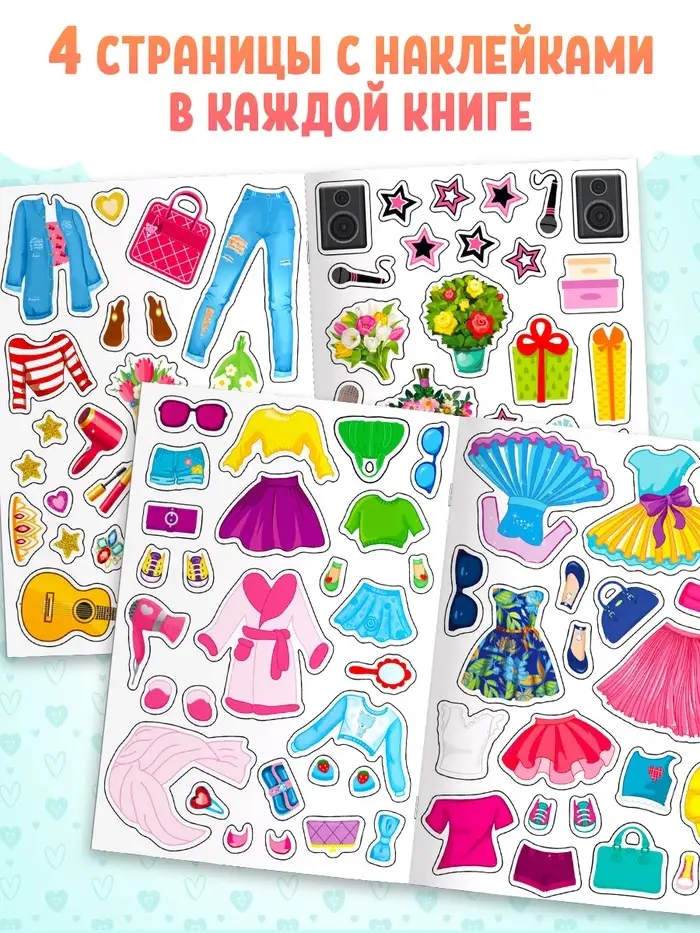 В каждой книге малышку ждёт более 100 цветных наклеек с одеждой и аксессуарами для кукол.