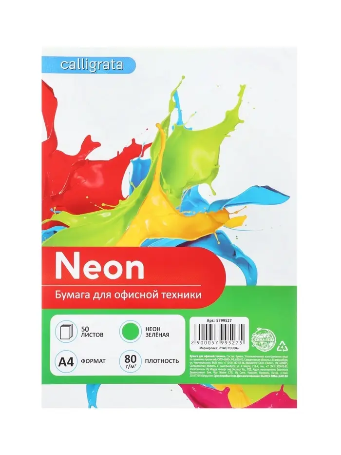 Бумага цветная Calligrata, А4, 50 листов, зелёная, неоновая, 80 г/м²