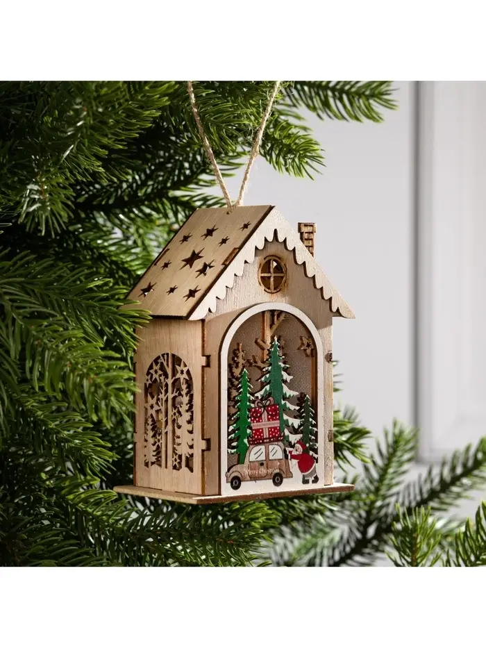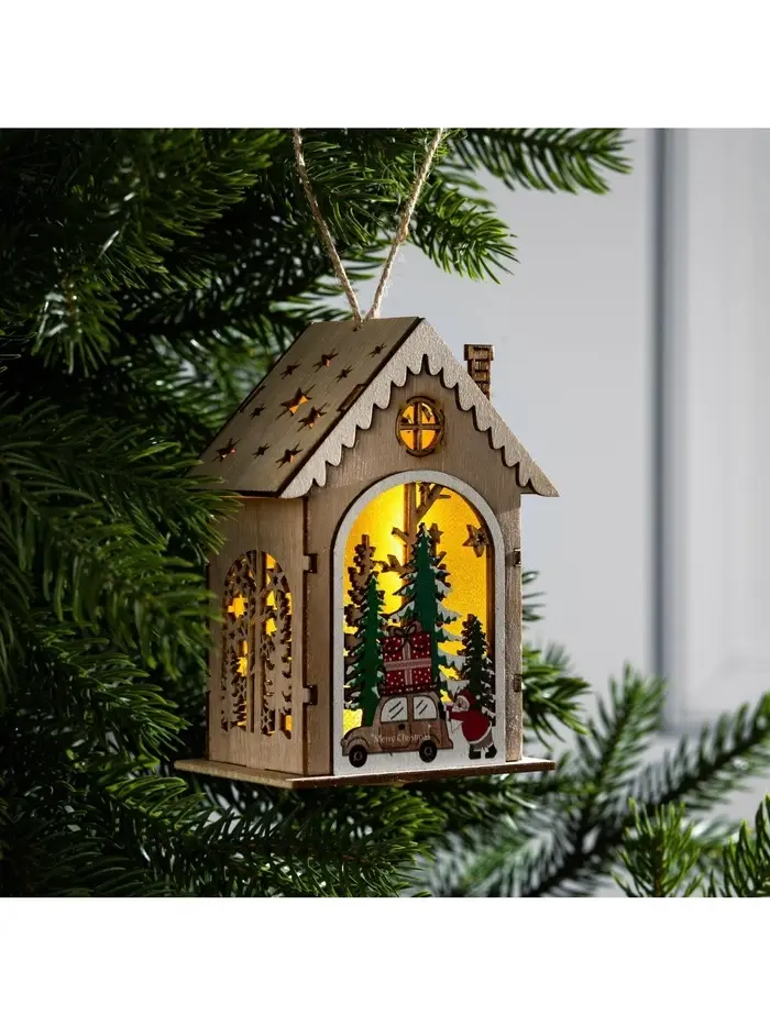 Ёлочная игрушка «Домик с Дедом Морозом и машиной», 8.2×4.2×7.3 см, от батареек, свечение тёплое белое