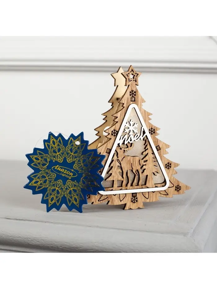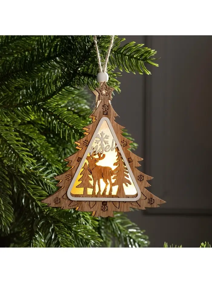 Светящееся деревянное украшение «Ёлочка с оленем» — новогодняя фигурка в скандинавском стиле с тёплым свечением. Игрушка диаметром 11 см полностью готова к празднику — батарейки LR41 уже вложены в комплект.