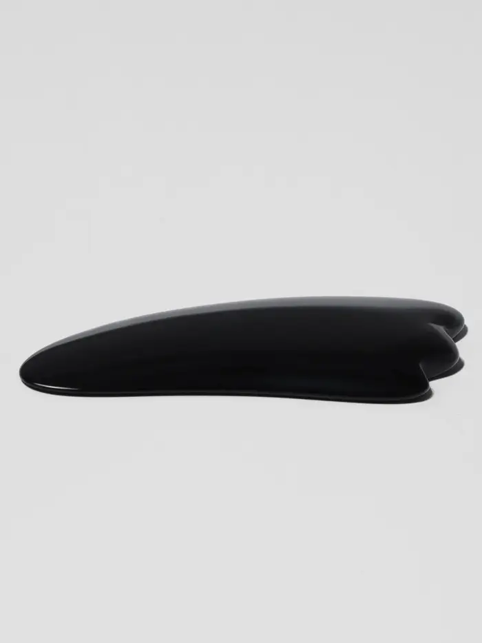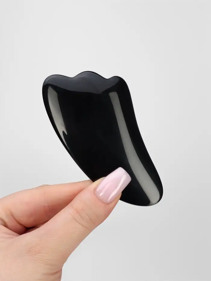 Чёрный массажер гуаша для лица – эргономичный инструмент для ежедневного ухода за кожей. Его компактный размер (9×5.2 см) удобно ложится в руку, позволяя прорабатывать зоны лба, скул и шеи. Подходит для домашнего массажа после очищения кожи или перед нанесением уходовых средств.