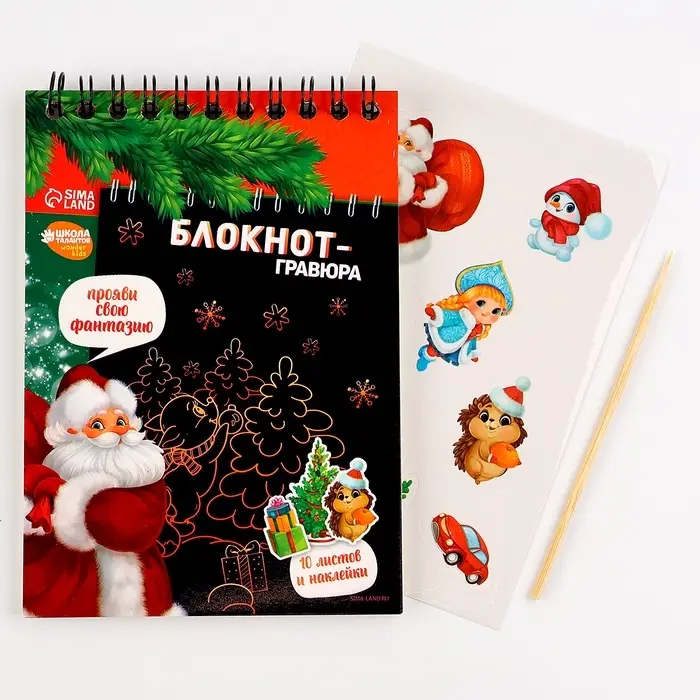 Блокнот-гравюра из 10 листов - это безграничное поле для фантазии! Создавайте узоры, рисунки, надписи! Рисуйте удивительные новогодние открытки, украшайте их наклейками из набора и делитесь своими шедеврами с друзьями и близкими.