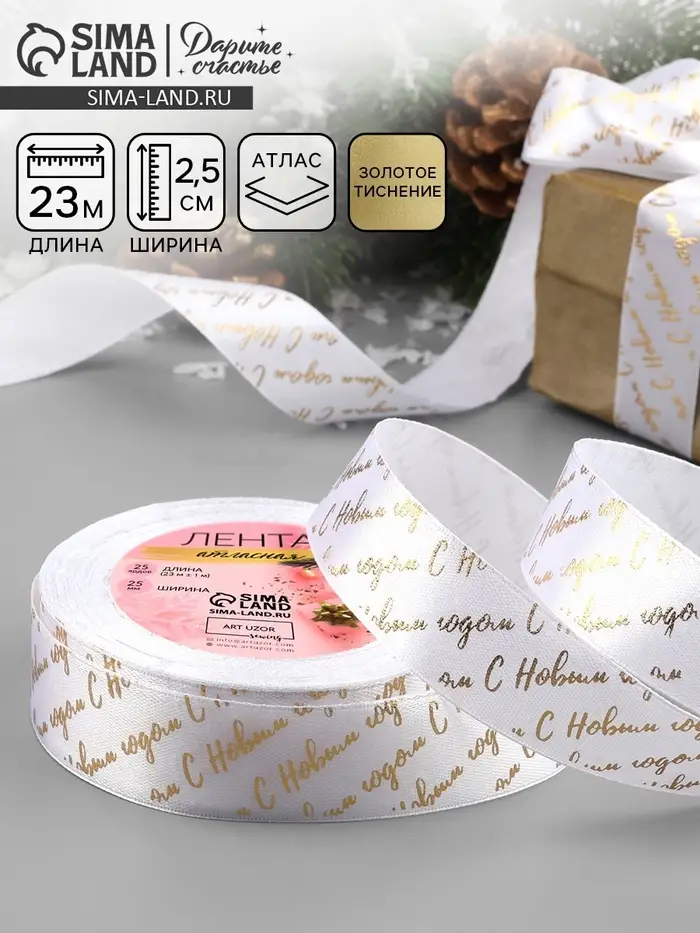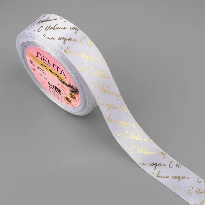 Лента атласная с тиснением «С Новым годом», 25 мм, 23±1 м, белая