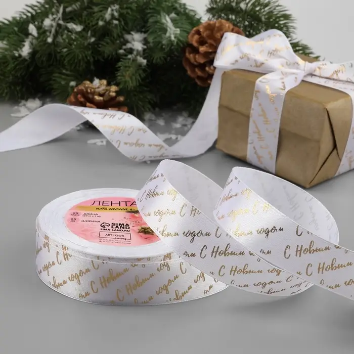 Новогодняя лента является универсальным помощником при изготовлении рукоделий, украшении интерьера, упаковке подарков и другого.