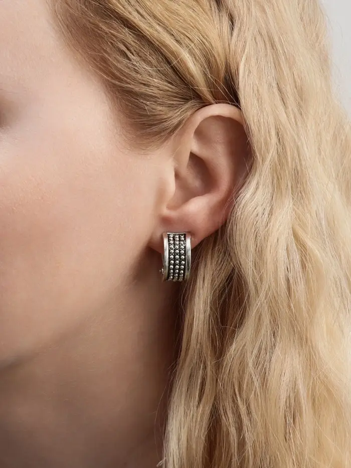 Изюминкой данных украшений стали сферические головки из матового металла с эффектом чернения, создающие впечатление богато отполированных старых монет. Шарики представлены небольшими размерами, что идеально соответствует современным представлениям о хорошем вкусе и сдержанной роскоши. Всё это делается возможным благодаря грамотному балансу между формой и весом изделия.