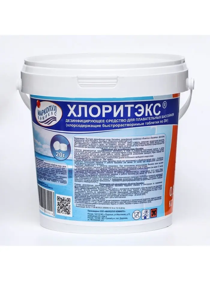 Средство Хлоритэкс для хлорной дезинфекции бассейна, в таблетках, быстро и эффективно действует на бактерии, грибы и вирусы, разрушает органические вещества, обуславливающие мутность воды. Не содержит кальция - может использоваться при любой жесткости воды, рН нейтрален.