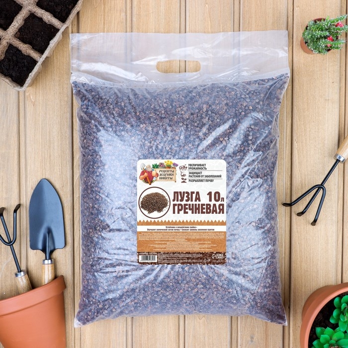 Полезное экологически чистое удобрение для участка. В своем составе лузга имеет такие элементы, как калий, фосфор, железо, магний и цинк, увеличивающие стрессоустойчивость и сопротивляемость растений грибковым и микробным заболеваниям. Вкусовые и питательные качества гречишной лузги привлекают дождевых червей, которые оказывают благоприятное влияние на плодородный слой почвы. Мульчирование гречишной лузгой позволяет сократить количество поливов и уменьшить колебания суточной температуры. Гречишная лузга позволяет снизить кислотность почвы, так как в процессе ее разложения происходит щелочная реакция.