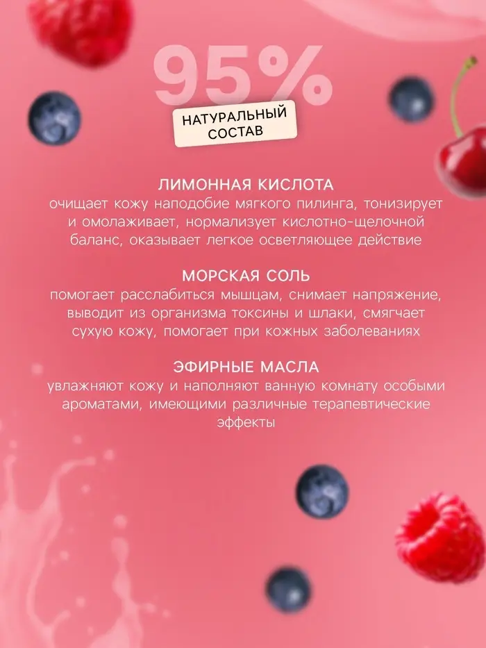 Бомбочка «Ягодный смузи» — это безопасный и ароматный способ сделать купание ребёнка ярким, весёлым и полезным для кожи, а также отличный подарок для маленьких любителей ягод и красочных водных процедур.