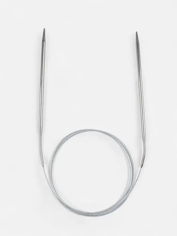 Круговые спицы представляют собой две металлические части, соединённые друг с другом тросиком. Инструмент незаменим при вязании полотна по кругу. С его помощью получаются изделия без дополнительных швов: шапки, рукава и горловины.