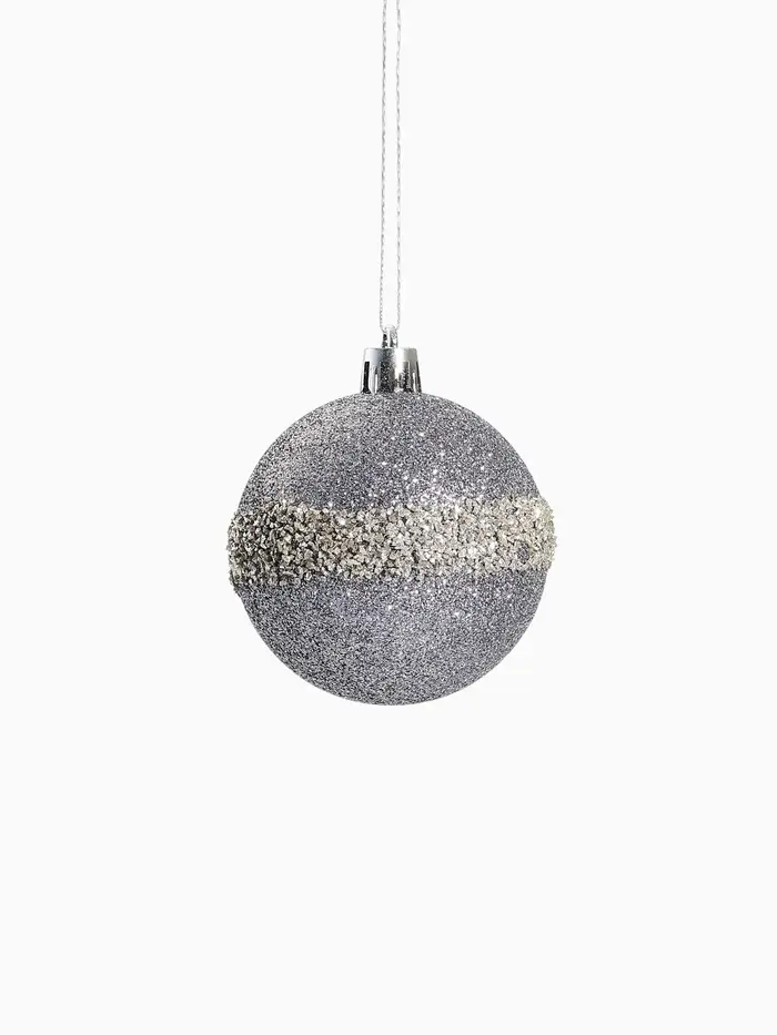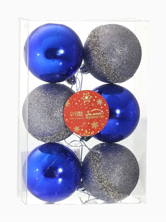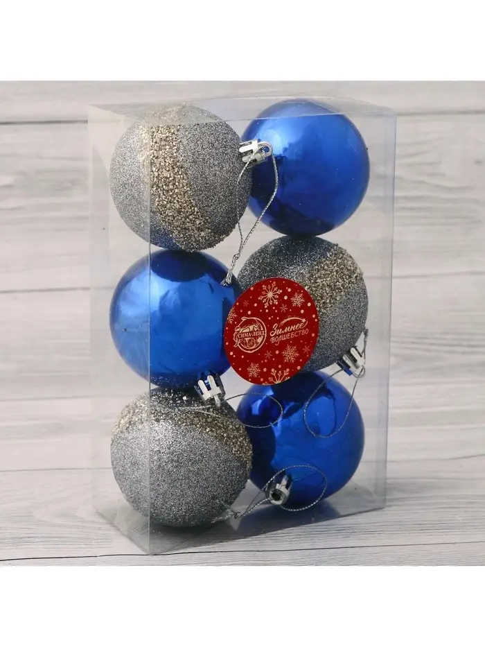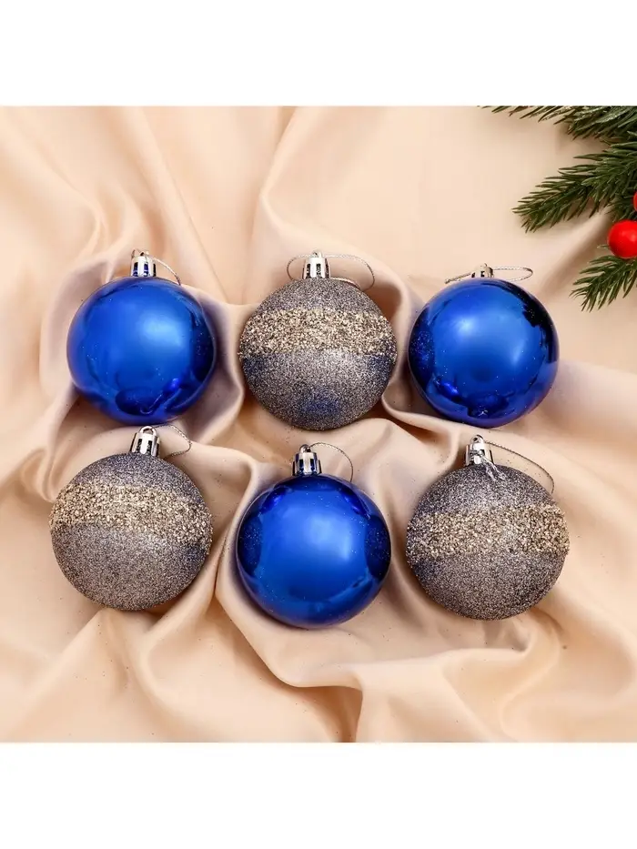 Набор из 6 ёлочных шаров диаметром 6 см сочетает серебристые и синие оттенки в однотонном исполнении с блестящими полосами. Эти пластиковые украшения в стиле фьюжн придают ёлке изящность и современный акцент.