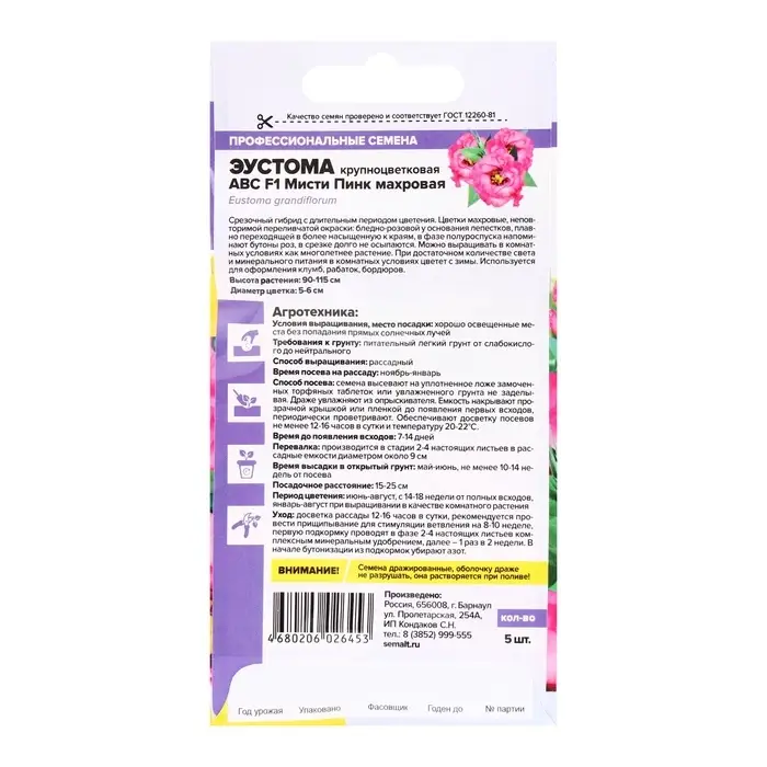 Семена цветов Эустома ABC "Мисти Пинк", махровая, Сем. Алт, ц/п, 5 шт