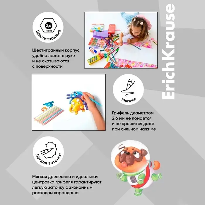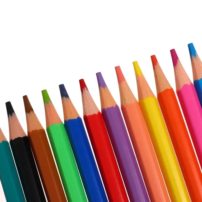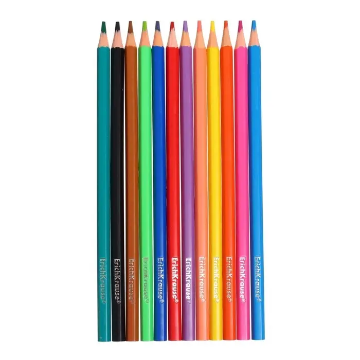 Идеальная центровка грифеля и пластичность материала карандаша гарантирует легкую заточку с экономным расходом карандаша. Грифель диаметром 2.6 мм не ломается и не крошится даже при сильном нажиме. Цвета в наборе: жёлтый, оранжевый, красный, розовый, лососевый, лиловый, синий, голубой, салатовый, зелёный, коричневый, чёрный.