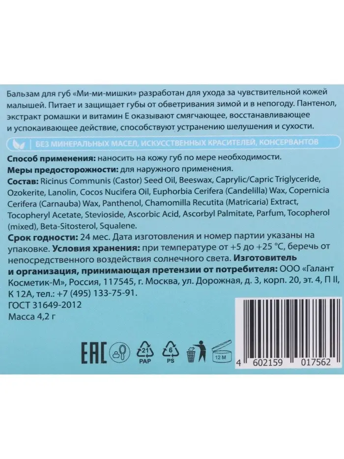 Описание: бальзам для губ «Ми-ми-мишки» разработан для ухода за чувствительной кожей малышей. Питает и защищает губы от обветривания зимой и в непогоду. Пантенол, экстракт ромашки и витамин Е оказывают смягчающее, восстанавливающее и успокаивающее действие, способствуют устранению шелушения и сухости.