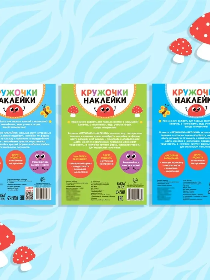 В набор «Умный малыш» входит 3 развивающих книги с наклейками-кружочками на разные темы: