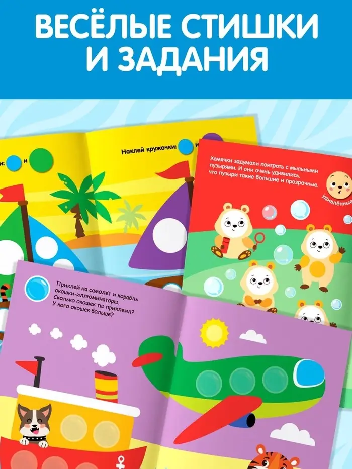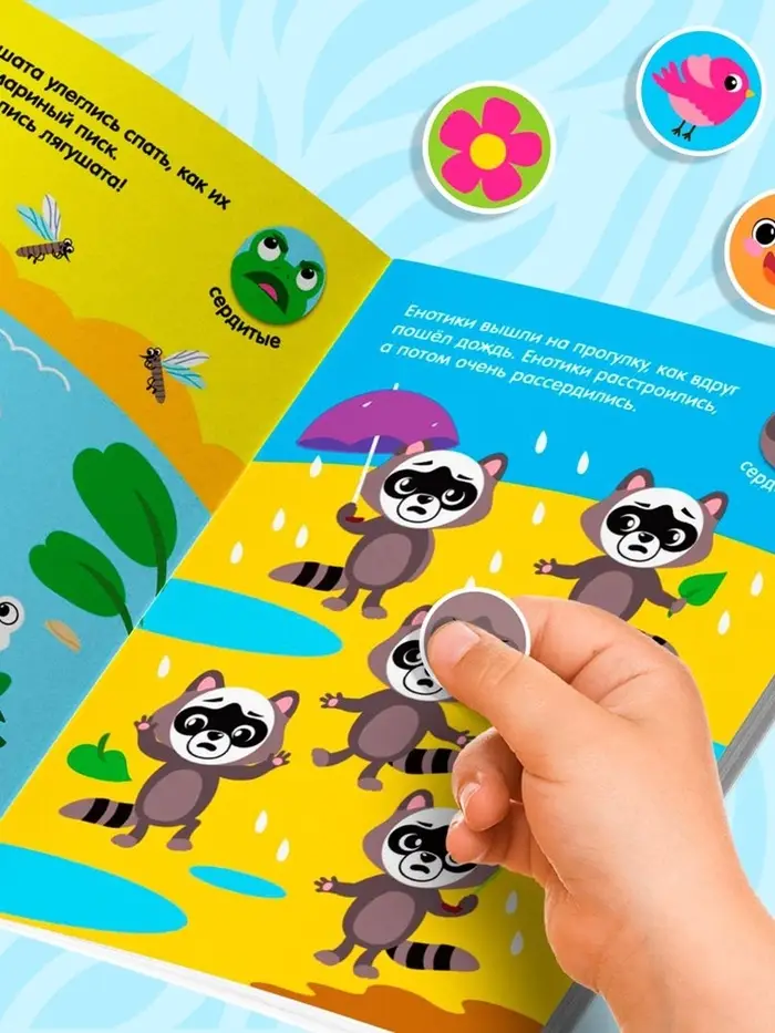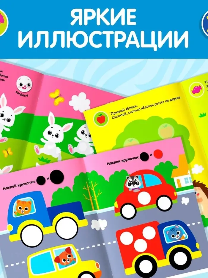 - На каждом развороте книги свой сюжет и небольшая подсказка, куда именно нужно приклеить кружочек.