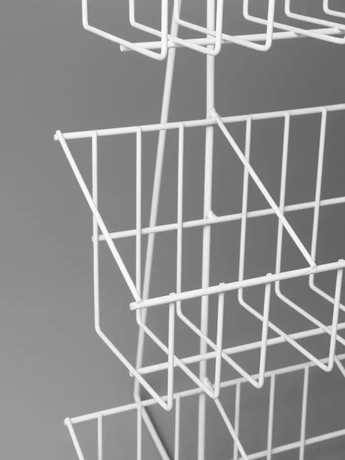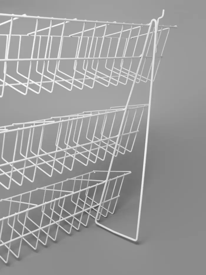 Функциональные особенности: Настенный тип размещения позволяет эффективно использовать вертикальные поверхности торговой точки, не занимая площадь пола или прилавка. Сетчатая структура ячеек обеспечивает полную видимость товара и свободный доступ к продукции для покупателей.