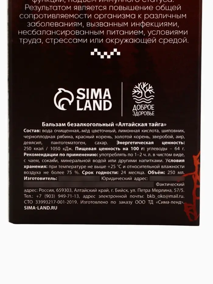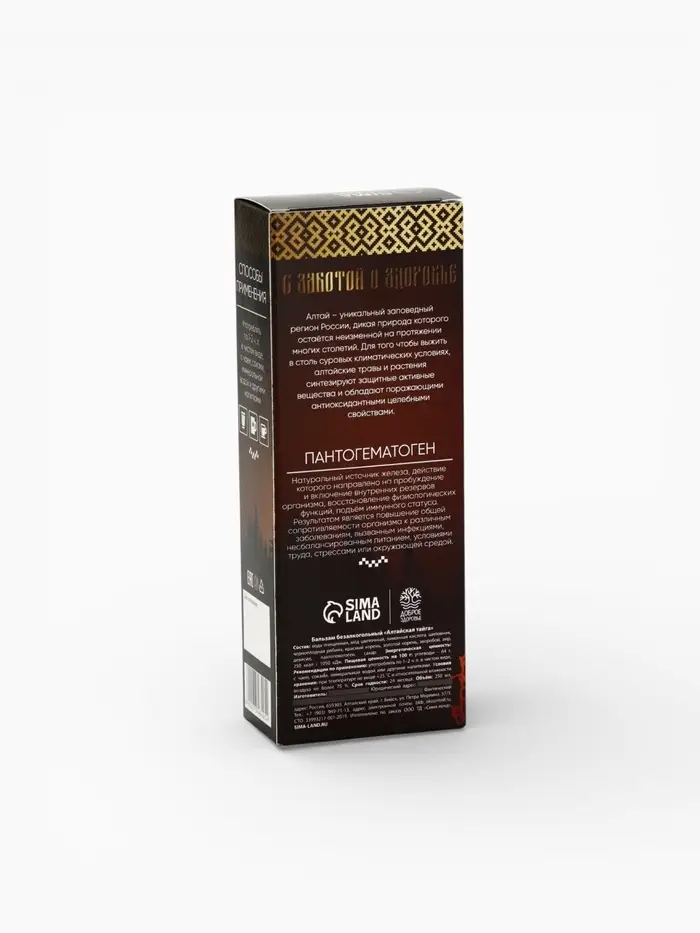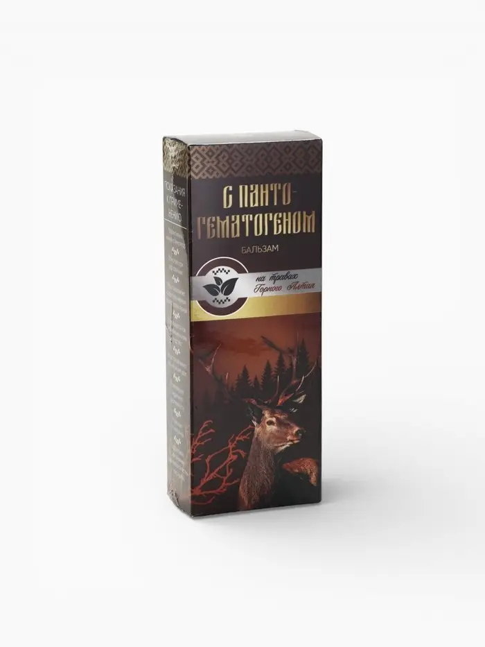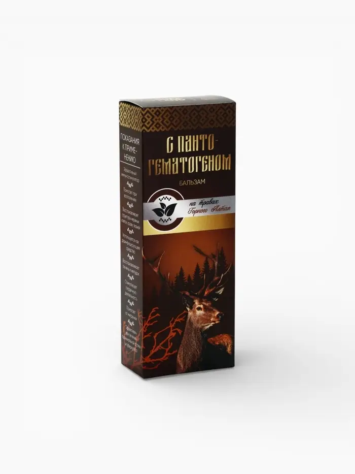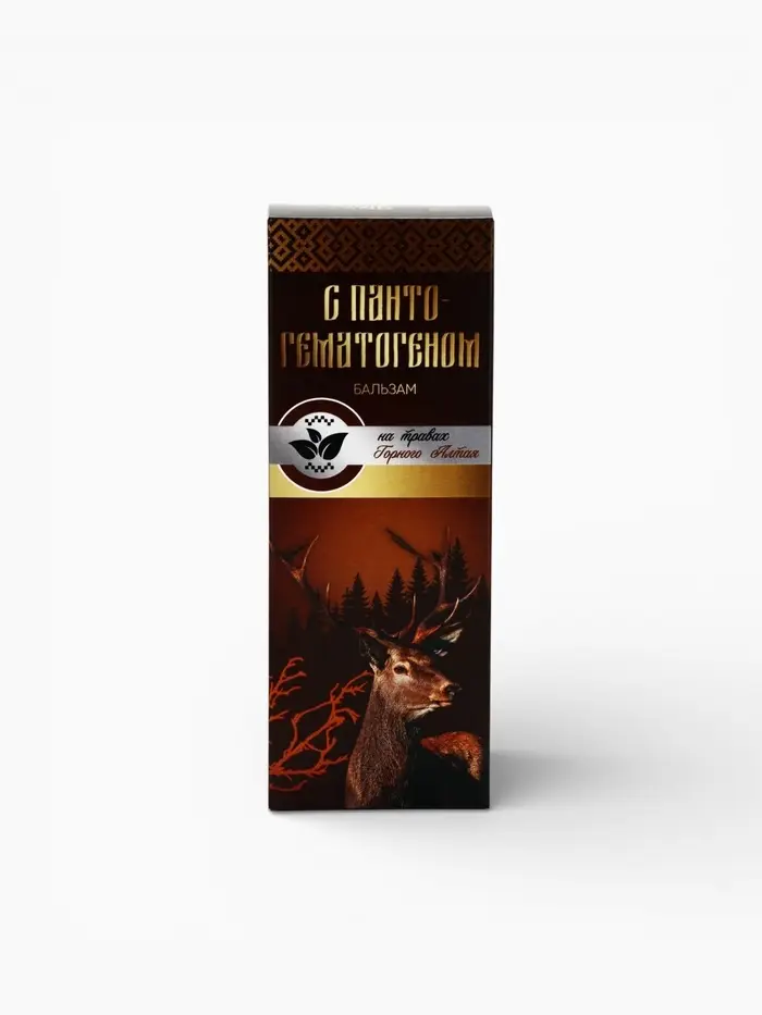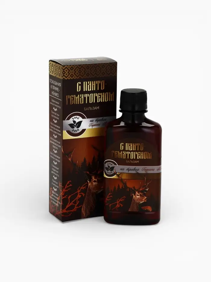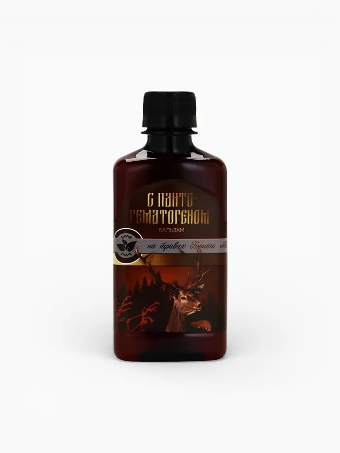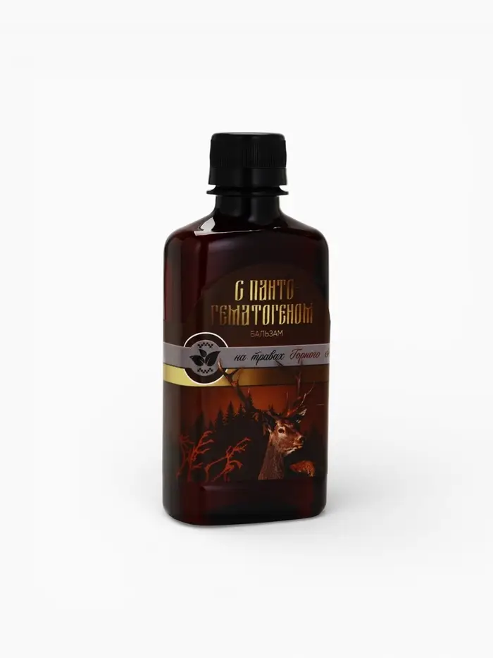 Бальзам безалкогольный «С пантогематогеном»: шиповник, рябина, красный корень, золотой корень, зверобой, аир, девясил, пантогематоген, в пластиковой бутылке, 250 мл.