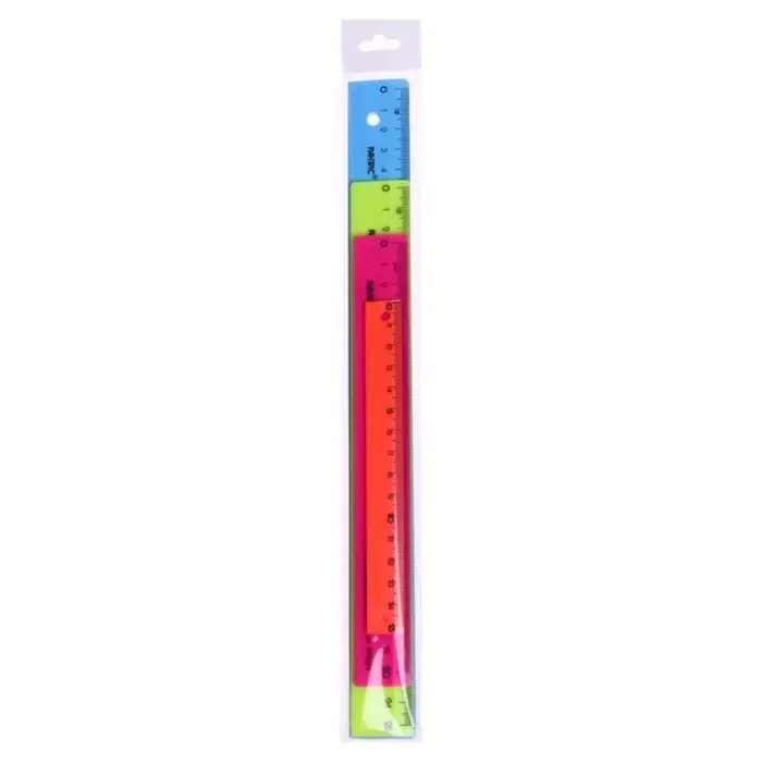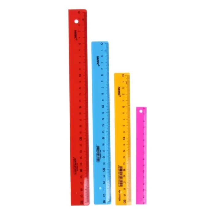 Комплект из четырёх линеек создаёт универсальную измерительную систему для любых форматов. Разная длина инструментов (15, 20, 25 и 30 см) охватывает весь спектр задач — от работы в ежедневнике до оформления плакатов. Непрозрачная основа в разных цветах не отвлекает внимание от шкалы и помогает быстро идентифицировать нужный размер.