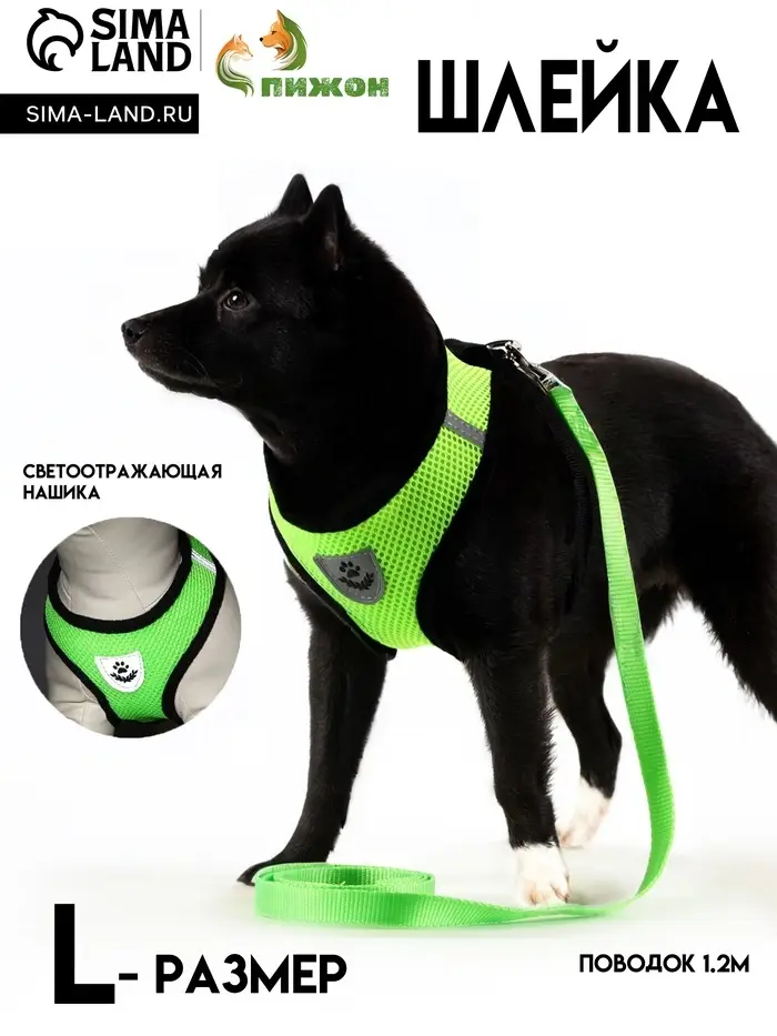 Шлейка с поводком, размер L, ОШ 33, ОГ 36-48, мягкая, со светоотражающей нашивкой, зелёная