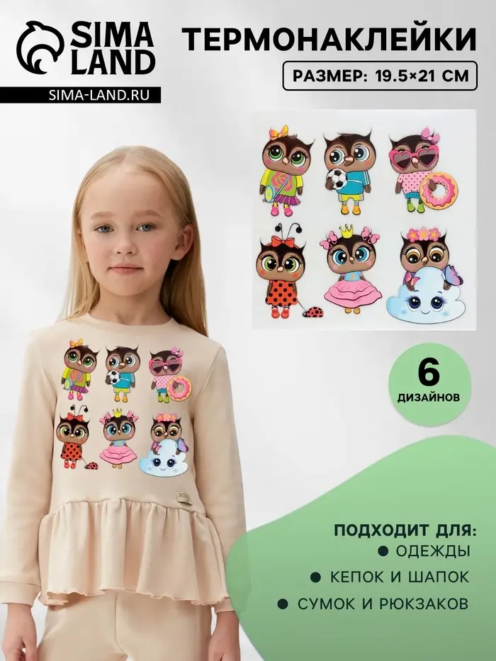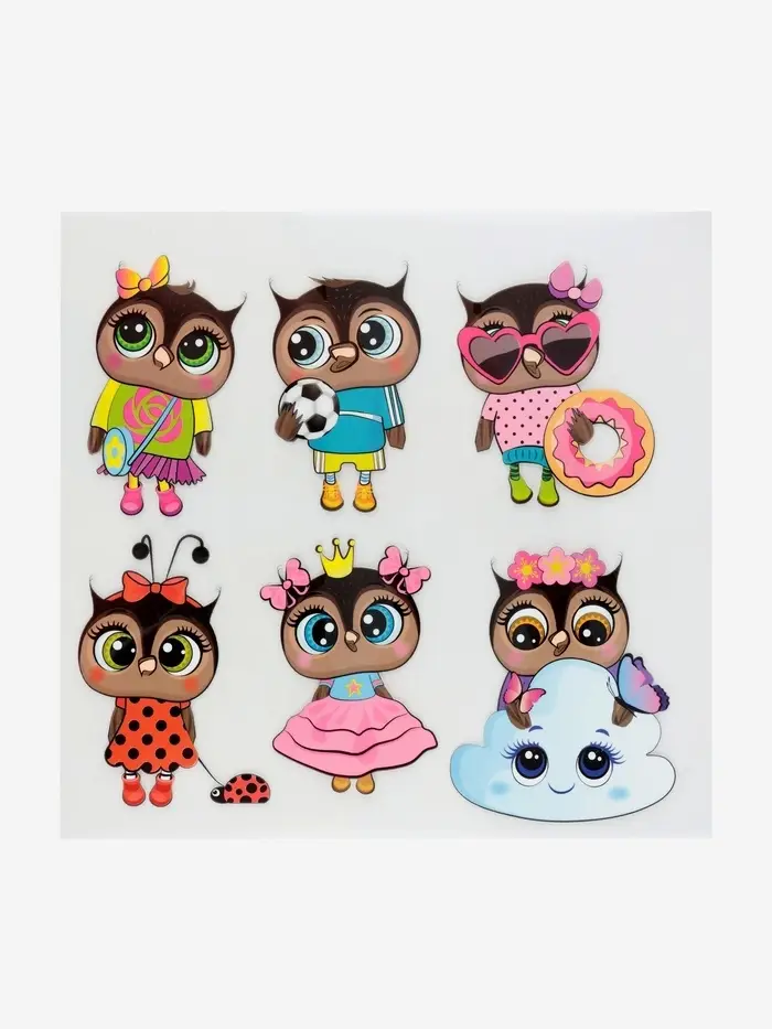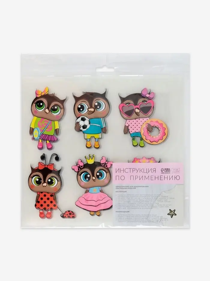 Термонаклейки с мудрыми совушками добавят волшебства детским вещам. Шесть разноцветных дизайнов размером 19.5×21 см создают уютную лесную атмосферу, особенно нравясь девочкам. Каждая сова легко переносится на ткань обычным утюгом.