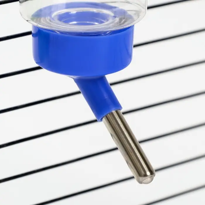 - Универсальное крепление: поилка надёжно фиксируется на прутьях стандартных клеток — не шатается, не падает и не мешает движению питомца.