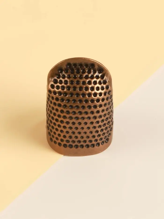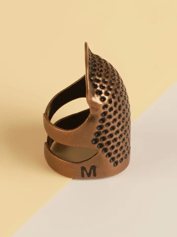Этот бронзовый напёрсток создан для вышивальщиц с длинными ногтями. Его раздвижная конструкция мягко фиксируется на пальце, не сдавливая и не соскальзывая. Металлический корпус надёжно защищает от уколов иглы, сохраняя манёвренность и чувствительность подушечки пальца. Он становится естественным продолжением руки, делая работу в смешанных техниках вышивания быстрой и аккуратной.