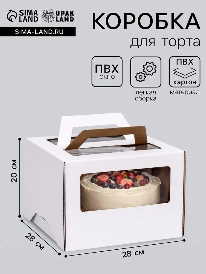 - Вместительный размер 28×28×20 см: Коробка предназначена для крупных бисквитных и капкейковых тортов, высоких десертов и сложных композиций. Это формат для профессиональных заказов и масштабных праздников.