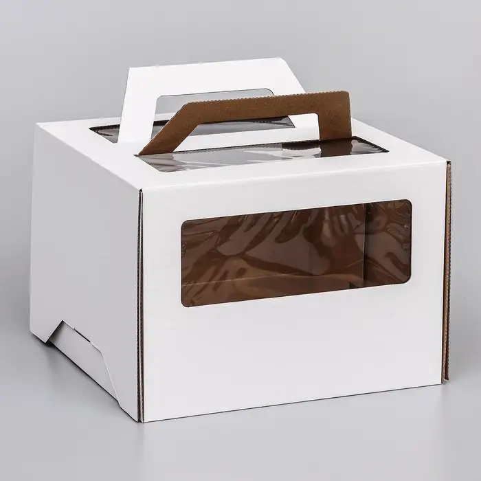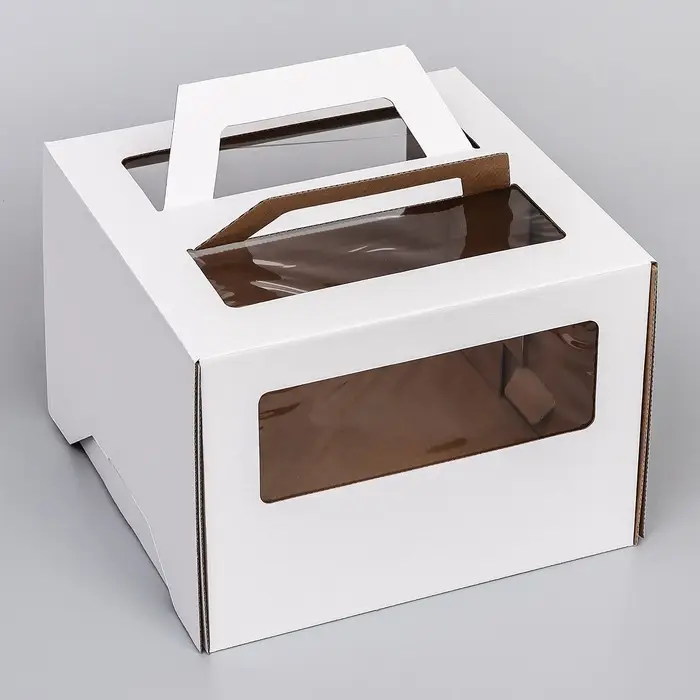 Коробка под торт 2 окна, с ручками, белая, 28×28×20 см