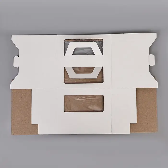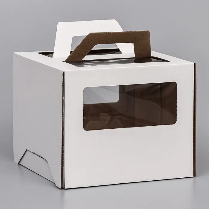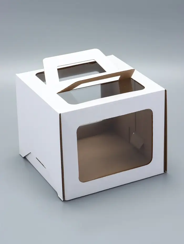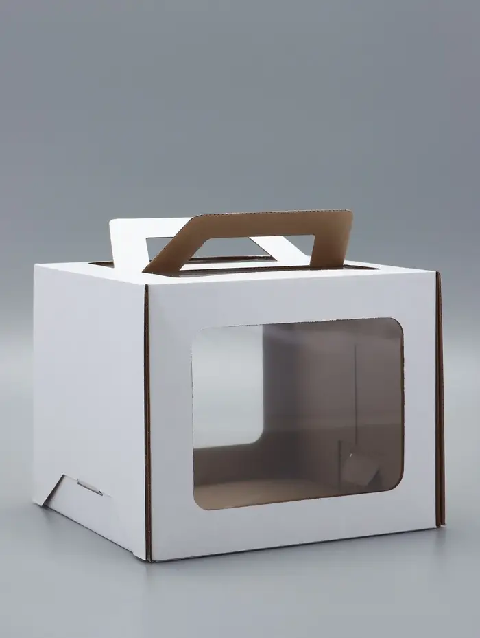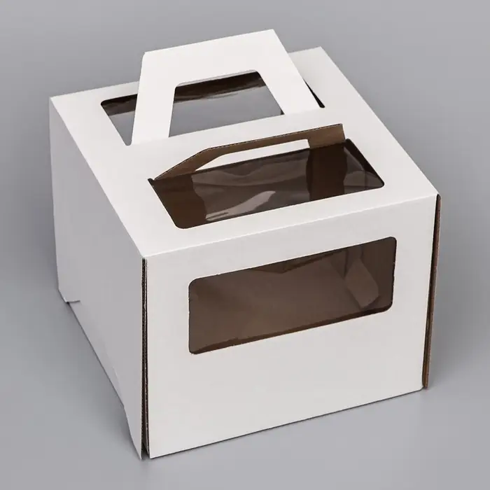 Удобная переноска и эффектная подача десерта! Белая коробка для торта с ручками и двумя окнами — это практичное решение для безопасной транспортировки и красивой презентации кондитерских изделий. Прочная конструкция надежно защищает торт, а прозрачные вставки показывать его во всей красе.