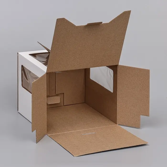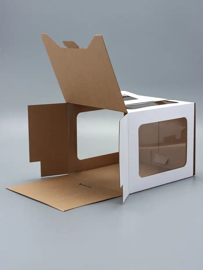 - Два широких окна для обзора: Сдвоенные прозрачные окошки открывают вид на десерт с двух сторон. Это выгодно демонстрирует кремовые узоры, украшения и слои торта, не нарушая целостность упаковки.