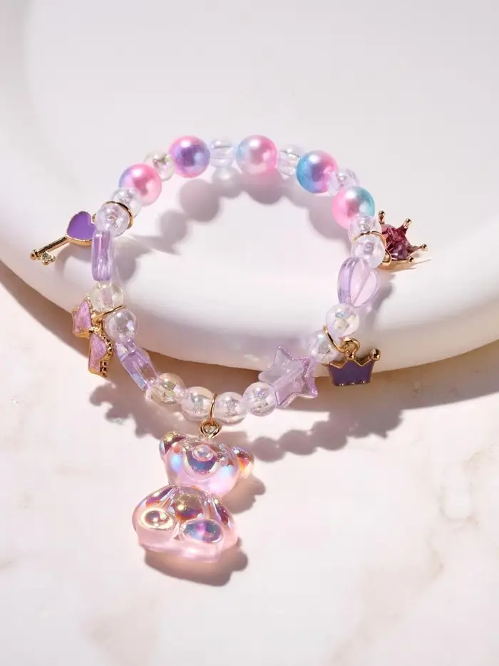 Фиолетовый детский браслет с бусинами и декоративными элементами в виде мишки и звёзд станет ярким аксессуаром для девочки. Изготовлен из пластика с золотистыми вставками, он не содержит застёжек, что обеспечивает лёгкость надевания и комфорт при носке. Диаметр 5,5 см оптимален для детского запястья.