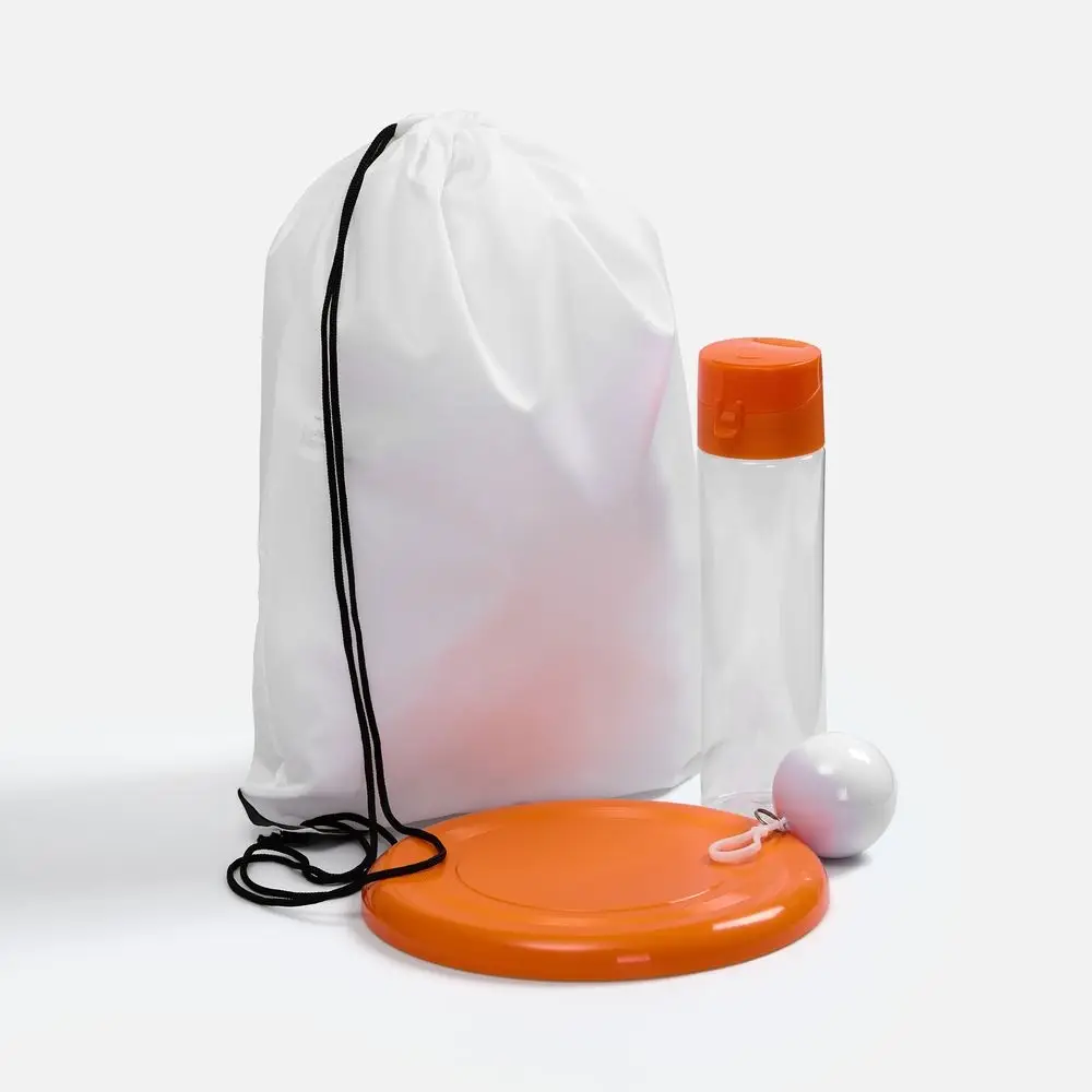 бутылка, футляр, тарелка-фрисби - пластик; плащ - полиэтилен, ПНД, плотность 12 мкм; рюкзак-мешок - спанбонд, плотность 70 г/м²