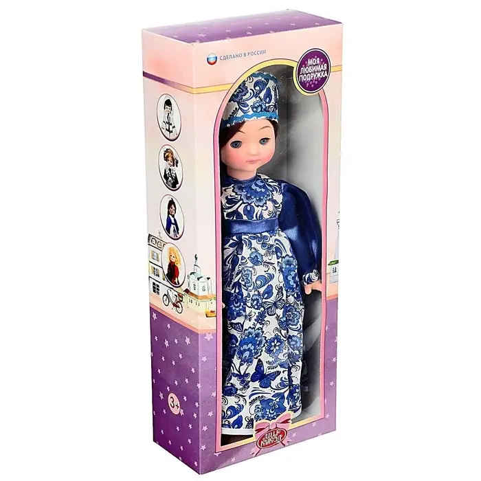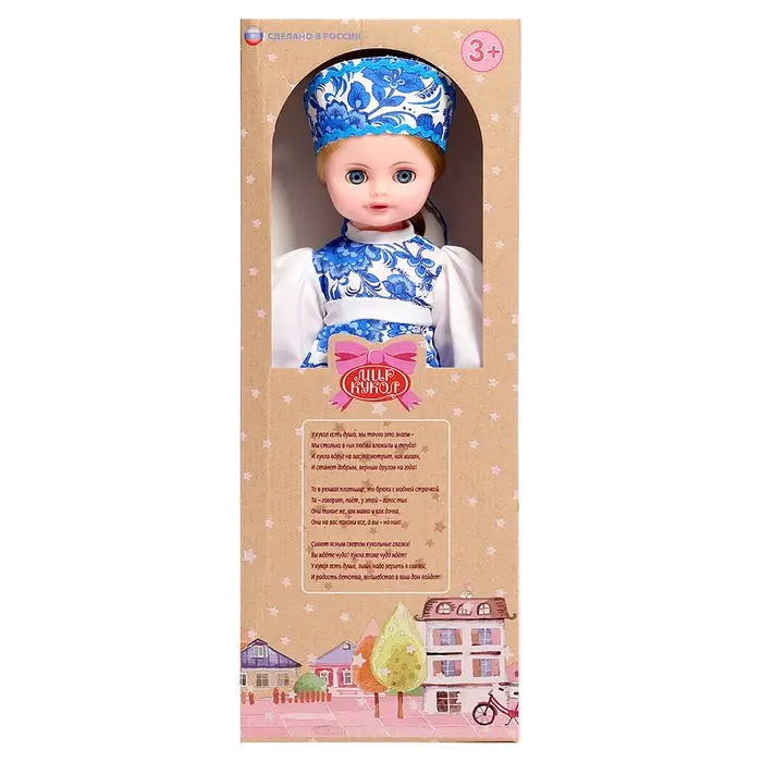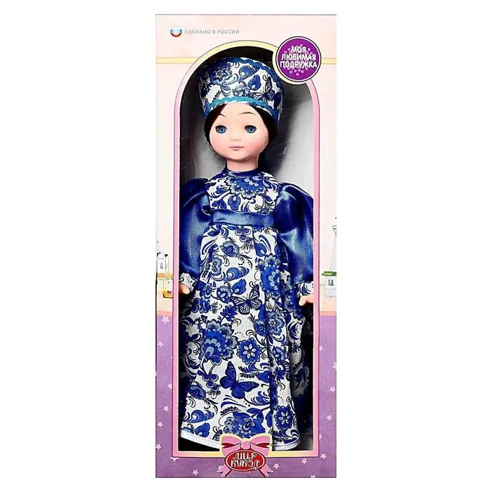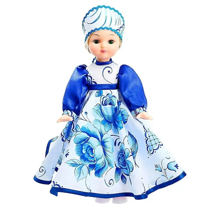 Кукла «Василина Гжель» — классическая кукла в образе, вдохновлённом традиционным русским стилем. Платье с характерным сине-белым орнаментом, аккуратный головной убор и спокойные черты лица создают цельный, узнаваемый образ, отсылающий к народной культуре и сказочным мотивам.