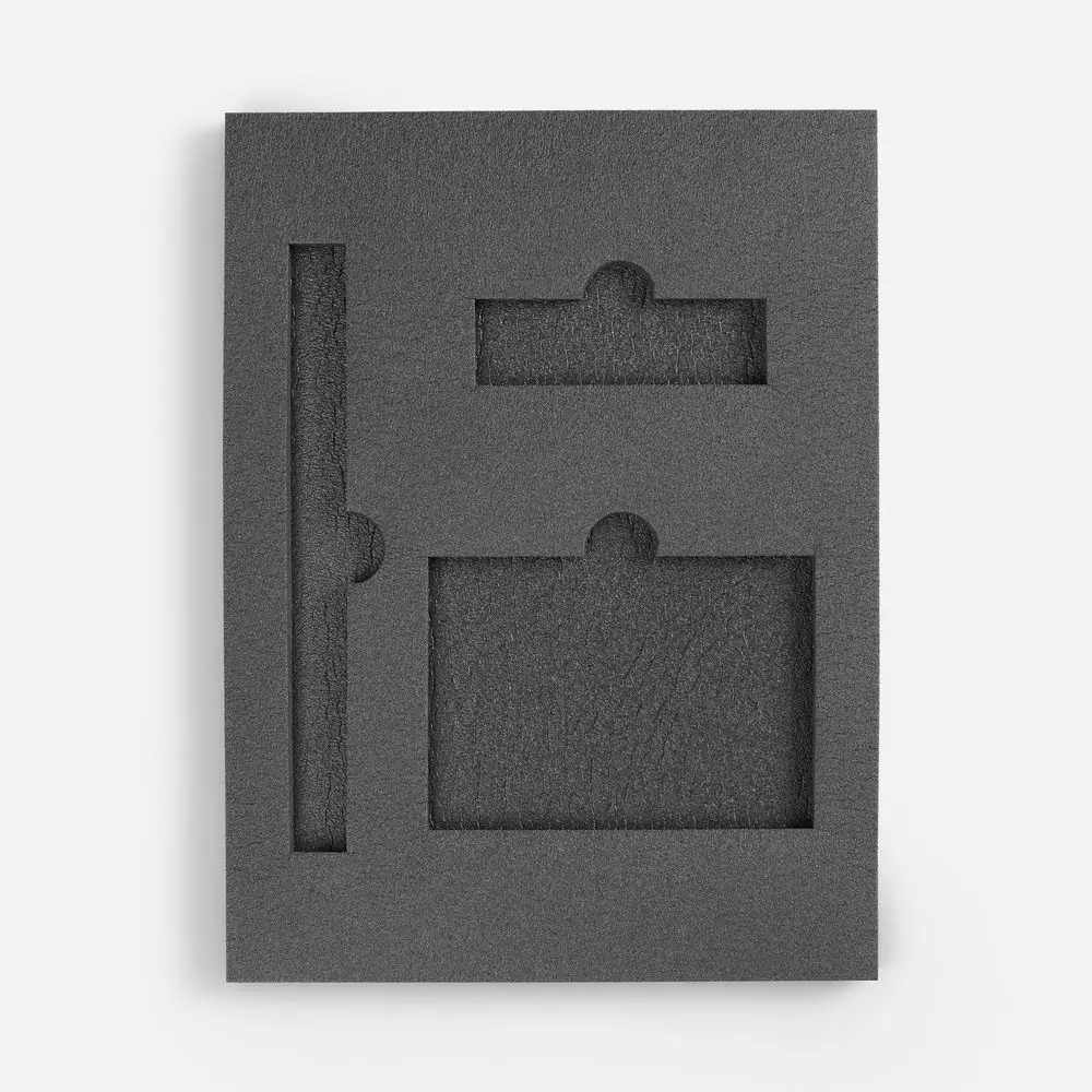 Ложемент, изготовленный из материала Izolon 500 черного цвета, представляет собой многослойную конструкцию, состоящую из нижнего слоя толщиной 5 мм и верхнего слоя толщиной 10 мм. В соответствии с утвержденным макетом, проемы для размещения предметов могут быть спроектированы как в одном, так и в обоих слоях.