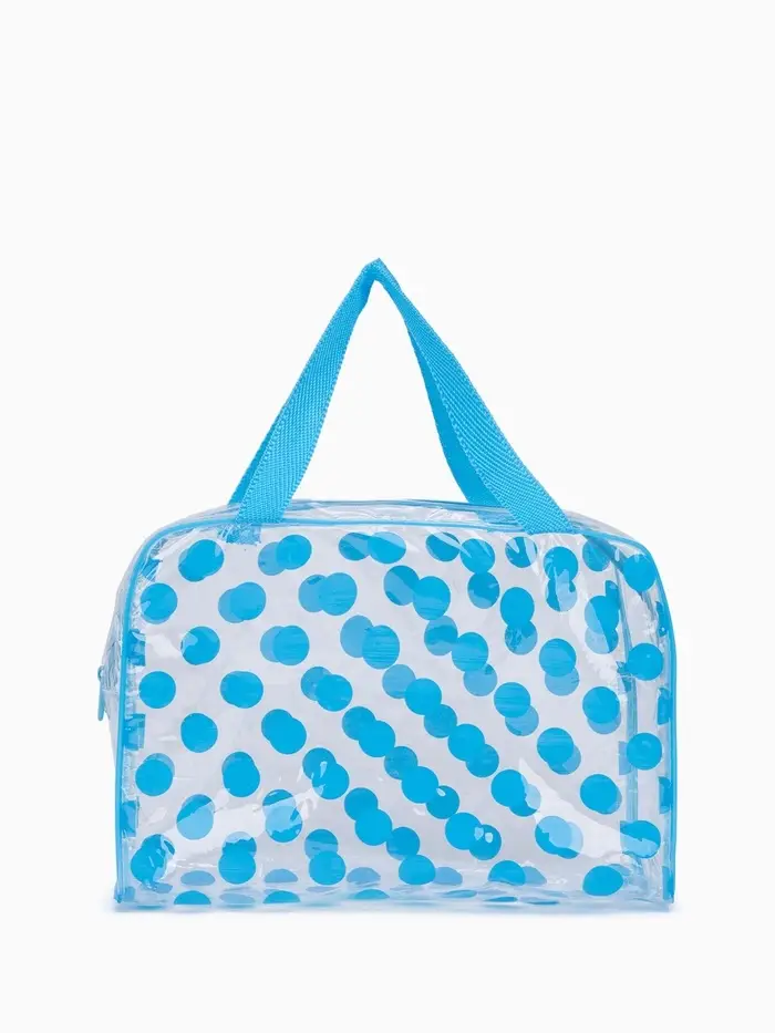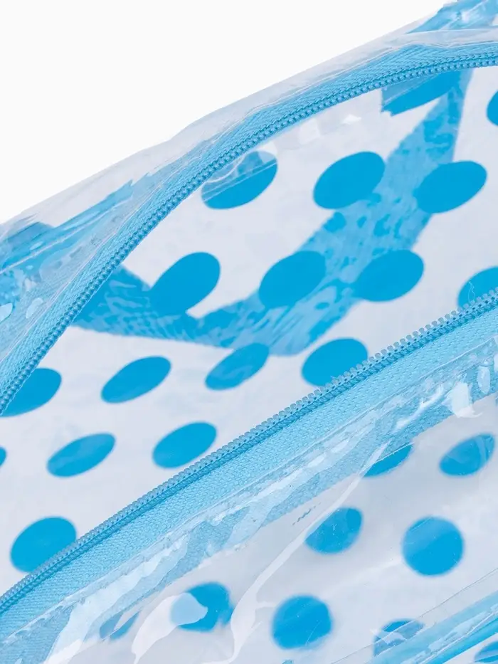 Эта полупрозрачная косметичка для бассейна — ваш идеальный спутник для водных развлечений и поездок. Голубой оттенок в горошек создаёт свежий и игривый образ, а практичный материал ПВХ надёжно защищает вещи от брызг и влаги. Просторное отделение с молнией легко вместит всё необходимое: от солнцезащитного крема и очков до мыльных принадлежностей после тренировки.