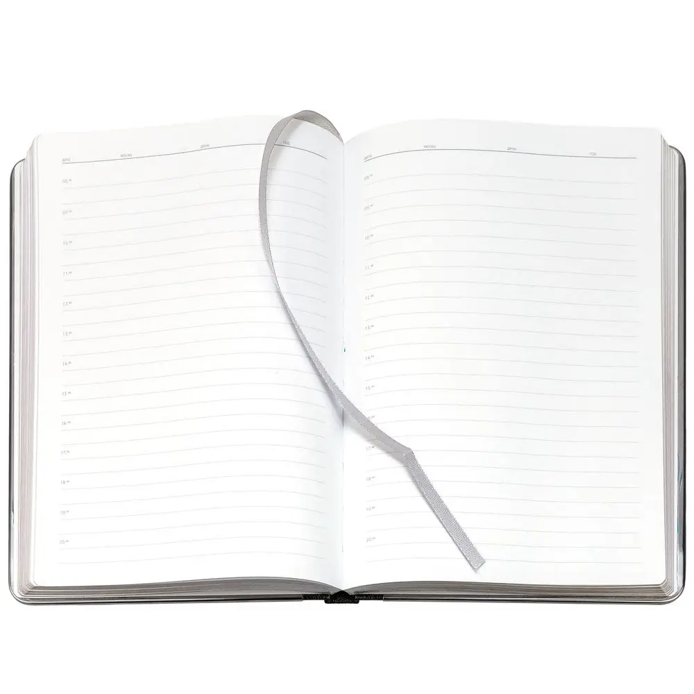 Ежедневник с твердой обложкой и серебристым обрезом, выполнен из материала Saffian, темно-серый, дополнен серым ляссе и металлическими рамками.