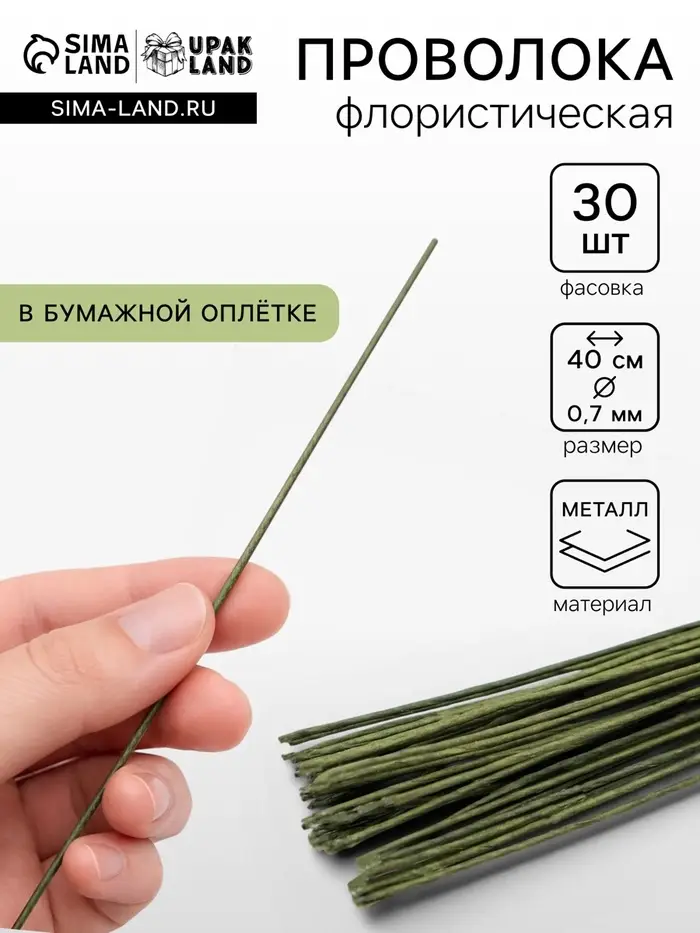 Набор флористической проволоки в зелёной оплётке 40 см, 0,7 мм, 30 штук — это стебли для искусственных цветов, каркас для букетов и материал для декоративных поделок. Бумажное покрытие маскирует металл под натуральный растительный оттенок.