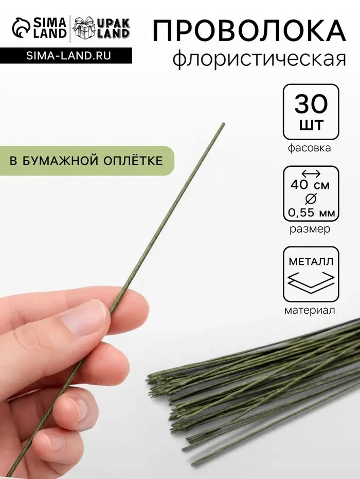 Набор флористической проволоки 0,55 мм, зелёная оплётка, 40 см, 30 штук — это тонкие стебли для создания нежных букетов, брошей и декоративных элементов. Бумажное покрытие скрывает металл и придаёт проволоке вид натурального растительного волокна.