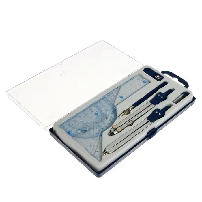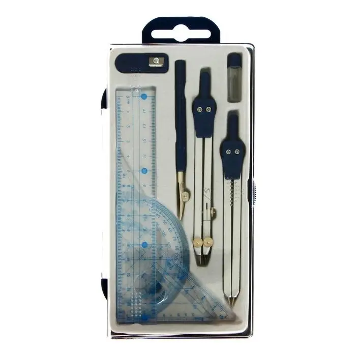 - Набор включает девять предметов: два металлических циркуля 130 мм, линейку, транспортир, два угольника, рейсфедер, точилку и грифели.