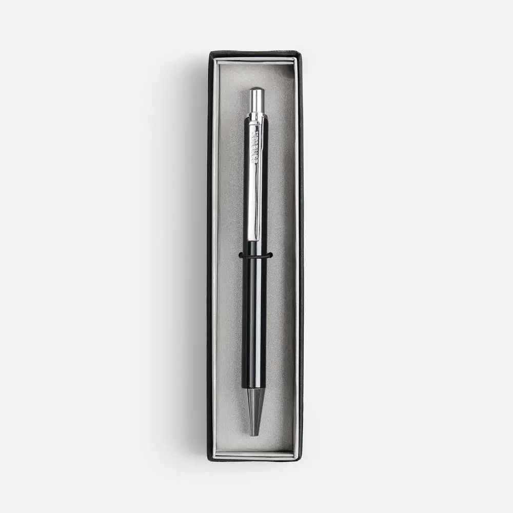 Шариковая ручка в лакированном корпусе с хромированными деталями. Футляр из дизайнерской бумаги с контрастным коробом придает подарку законченный и элегантный вид.