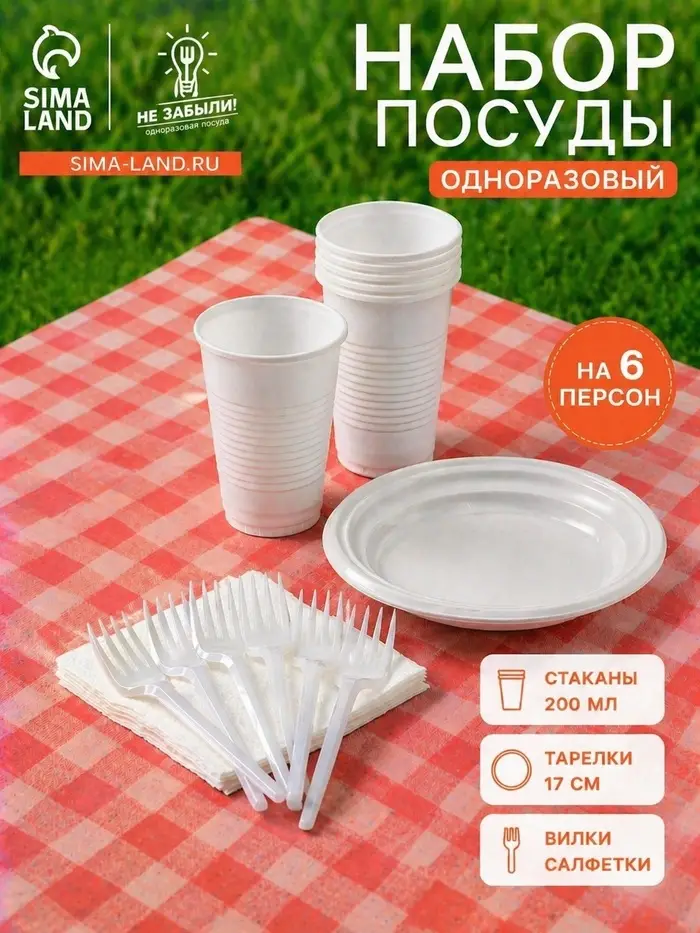 Набор пластиковой одноразовой посуды на 6 персон Не ЗАБЫЛИ! «Пикник», тарелки d=20.5 см, стаканы 200 мл, вилки