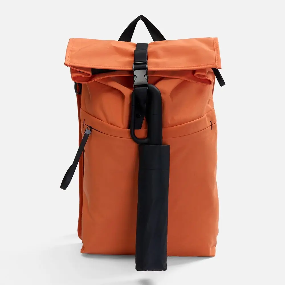 Преимущество обратного сложения заключается в том, что при закрытии внутренняя поверхность зонта остается снаружи, а мокрая сторона — запаковывается внутрь. За ручку-карабин удобно подвесить зонт на рюкзак или сумку.
