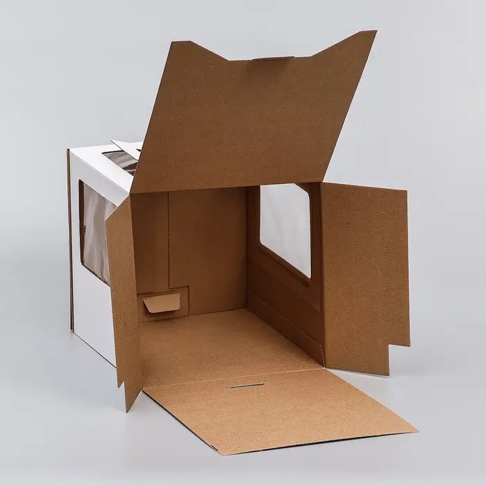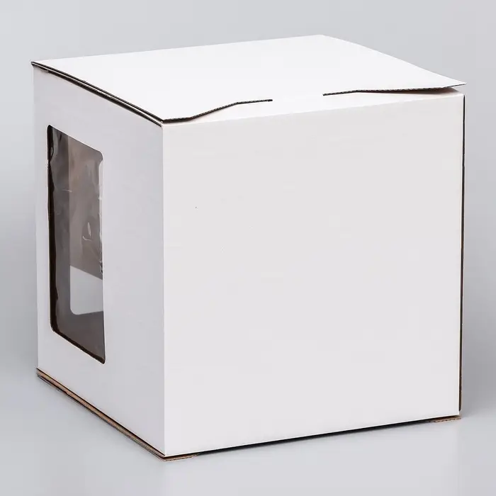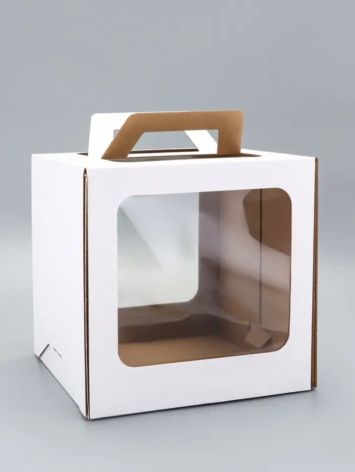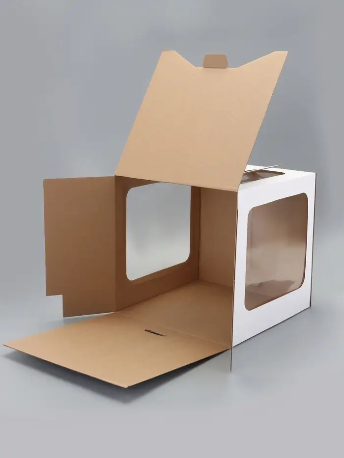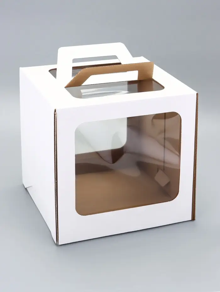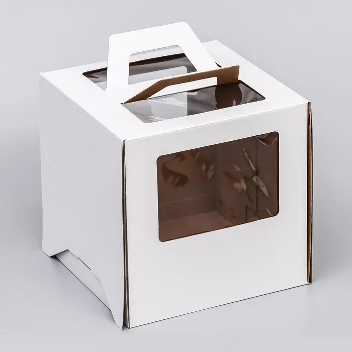 - Обзор без вскрытия: Два окошка обеспечивают видимость десерта со сторон. Можно оценить торт, не разбирая упаковку — это удобно при курьерской доставке.