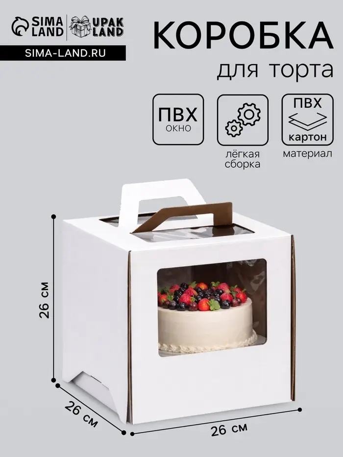 Для профессионального использования: Размер 26×26×26 см выбирают для тортов на крупные мероприятия — свадьбы, корпоративы или дни рождения. Квадратная форма упрощает компоновку десертов в кондитерских витринах. Упаковка решает задачу сохранения геометрии высоких тортов при перевозке.