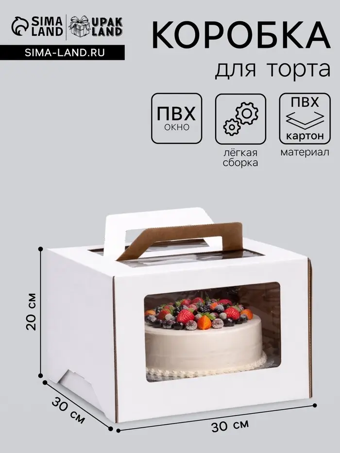 - Размеры коробки составляют 30 х 30 х 20 см, что обеспечивает достаточно места для среднего и крупного торта, а также позволяет разместить сладости, такие как капкейки или печенье, в дополнение к основному угощению.