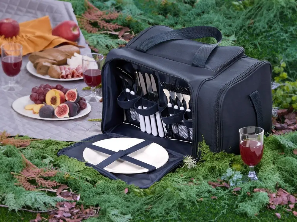 термосумка - полиэстер, плотность 230 г/м², PEVA; тарелки и бокалы - полистирол; приборы - нержавеющая сталь, пластик